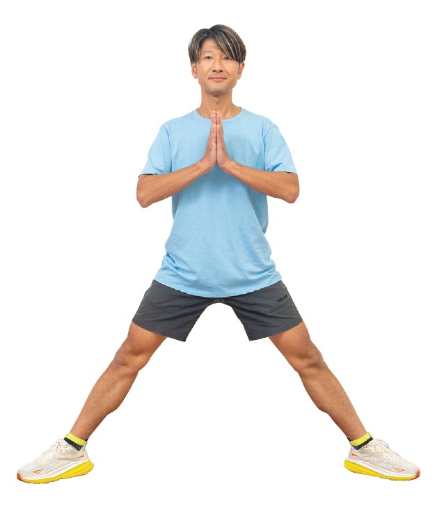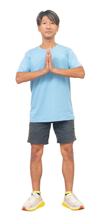 両足を肩幅に開き、つま先は外側に向け、両手で合掌のポーズをとる。
