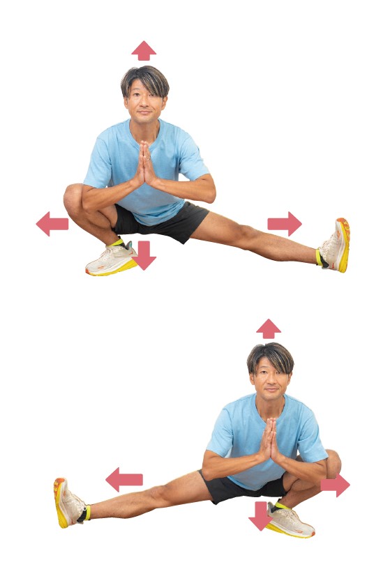 内ももの伸びを意識しながら左右交互に5 秒キープ× 5 往復 行う