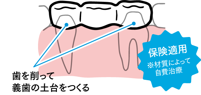 隣接する歯を削って、義歯と一緒に被せ物を橋渡し(ブリッジ)します。噛み心地は入れ歯より秀でていますが、健康な歯を多く削る必要があります。