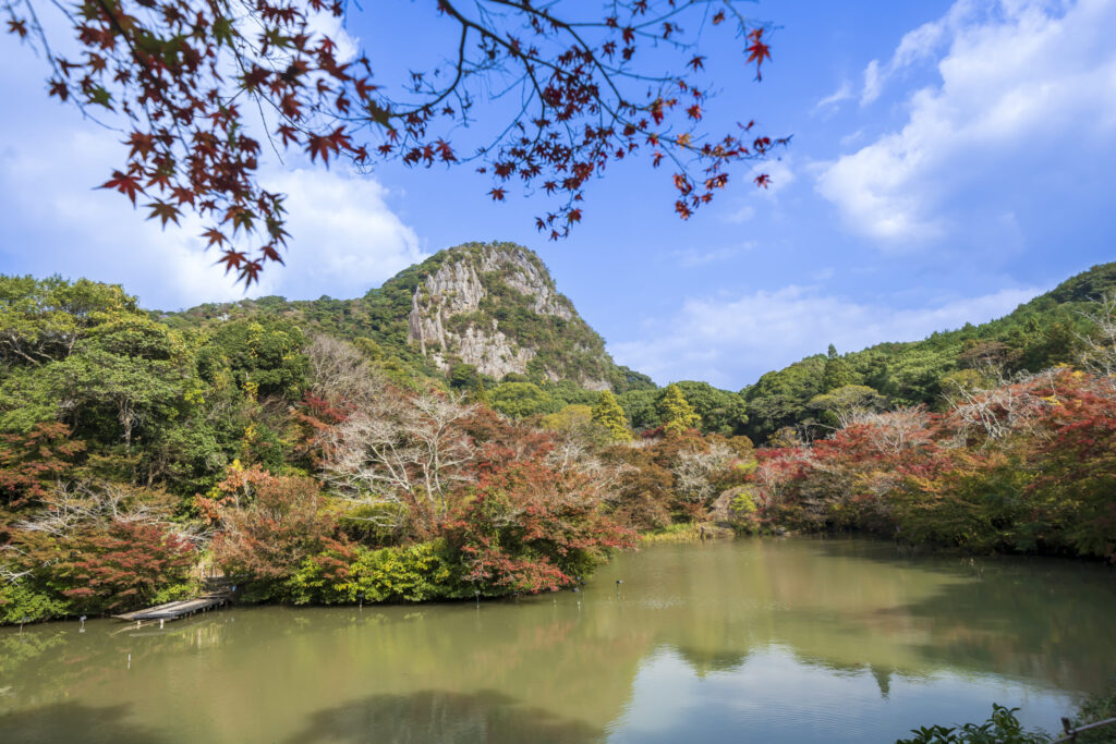 御船山の断崖を借景に、19世紀の武雄領主・鍋島茂義が完成させた池泉回遊式庭園。