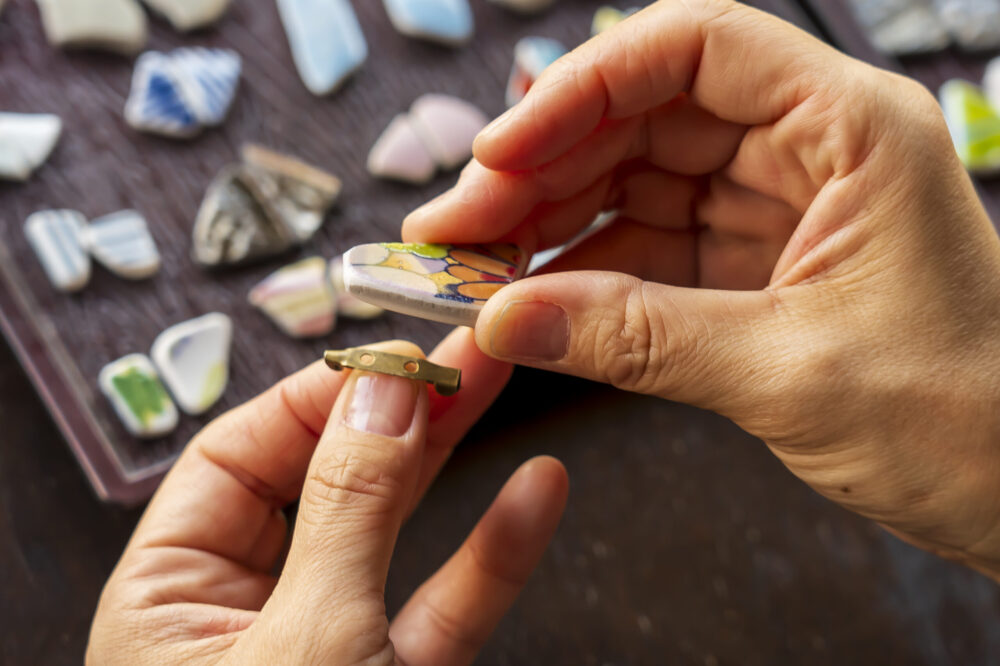陶片のなかからお気に入りを選んで、自分だけのアクセサリーが作れる。