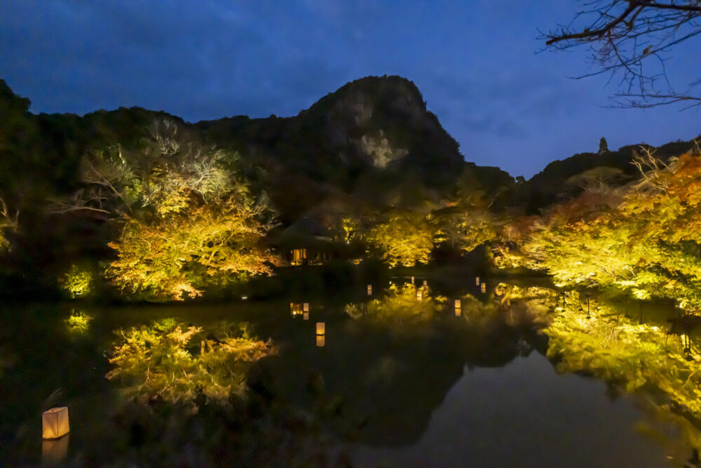 夜はライトアップされ、昼間とは違う姿に。水面に浮かぶランタンが幻想的。